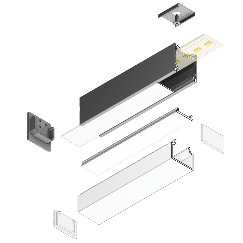 Profillänge nach Kundenwunsch mit Flexband und Treiber konfektionierbar, Ausführung als Pendelleuchte mit Baldachin, Farbe weiß lackiert oder schwarz eloxiert